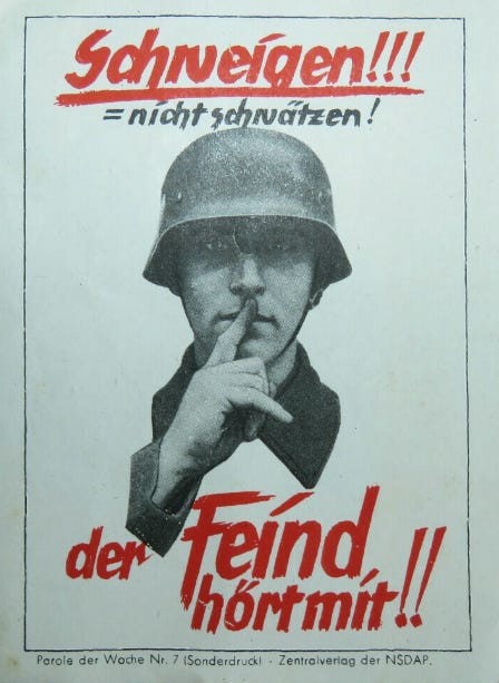 With the loss of individuality, the notion of the private is also obliterated. As Klemperer aptly points out, “LTI no more drew a distinction between private and public spheres than it did between written and spoken language — everything remains oral and everything remains public. One of their banners contends that ‘You are nothing, your people is everything.”8 This Nazi messaging is explicit: first, your personality and individuality mean nothing. Second, even if you do have thoughts of your own, you are never alone in them. Someone is always watching, even those closest to you.9