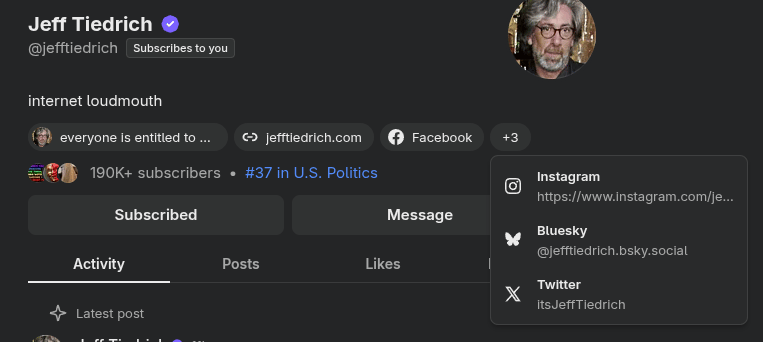 Cliff Schecter, founder of Blue Amp Media, shows 532K+ subscribers on his profile. A recently added person, LW, a contributor: 540K+. David Shuster, another contributor: presumably similar numbers. These arenât three separate half-million-person audiences who independently chose these three individuals. These are the same 540,000 people who subscribed to Blue Amp Media as an entity. The publication. Not the contributors.